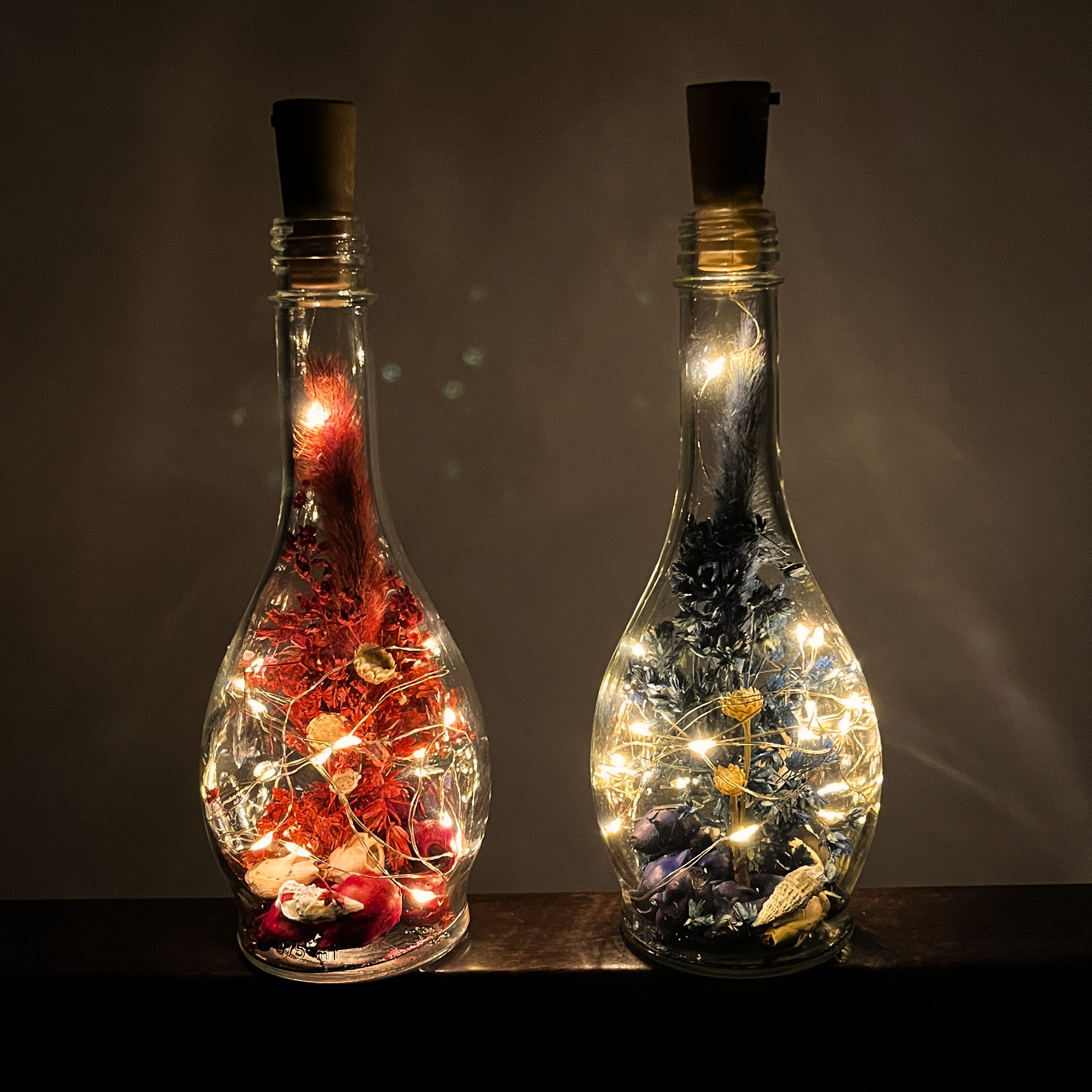 - Fio de LED alimentado por 3 pilhas de relógio. Liga e desliga na rolha. Incluso 3 pilhas.